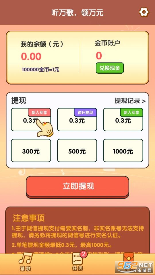 《点点猜歌能提现版本》是一款非常给力的手机猜歌赚钱平台,这款软件的赚钱方式方法非常简单,只需要用户按照要求进行猜歌即可,正确率越高奖励越好,提现也非常轻松方便,感兴趣快来962下载吧!