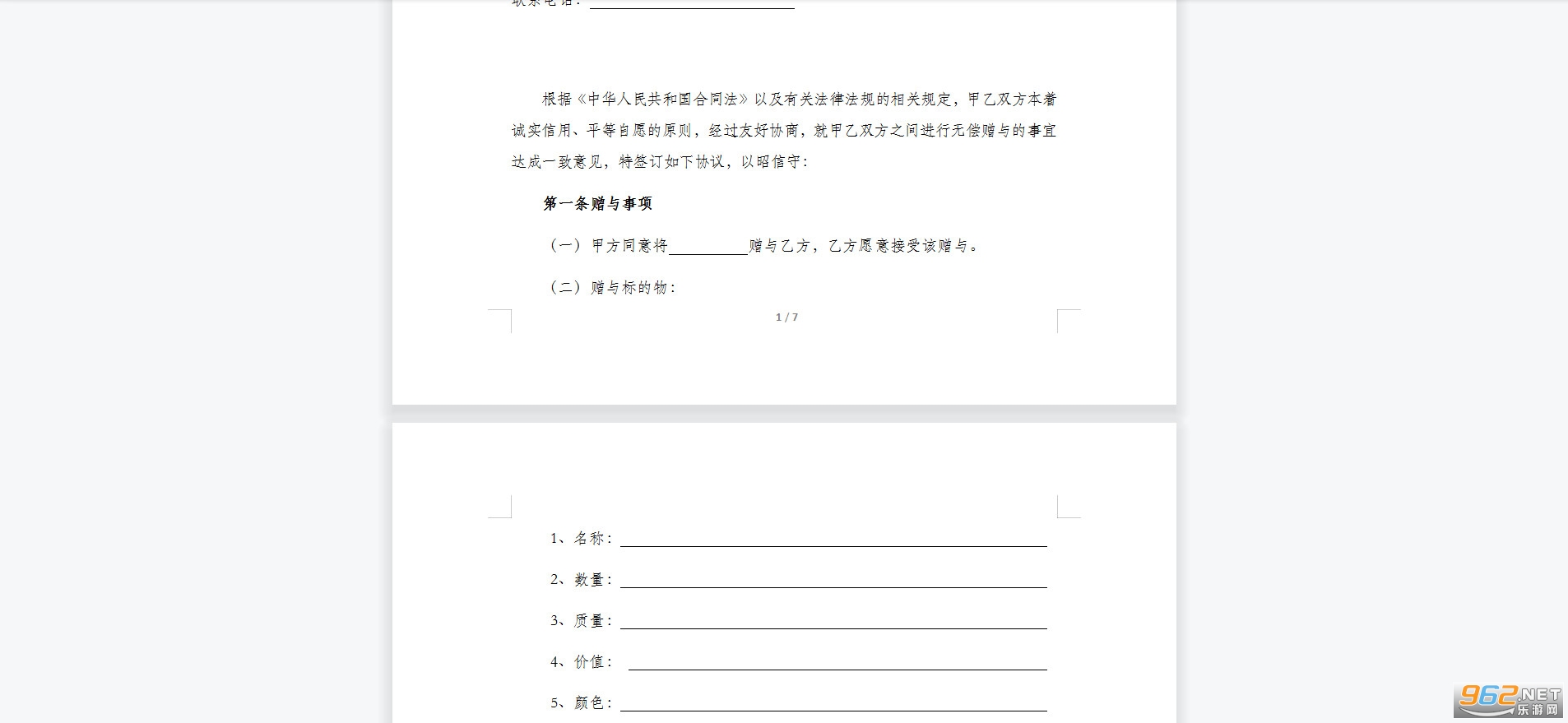 (一)本合同约定,甲方对乙方的赠与为无偿赠与。