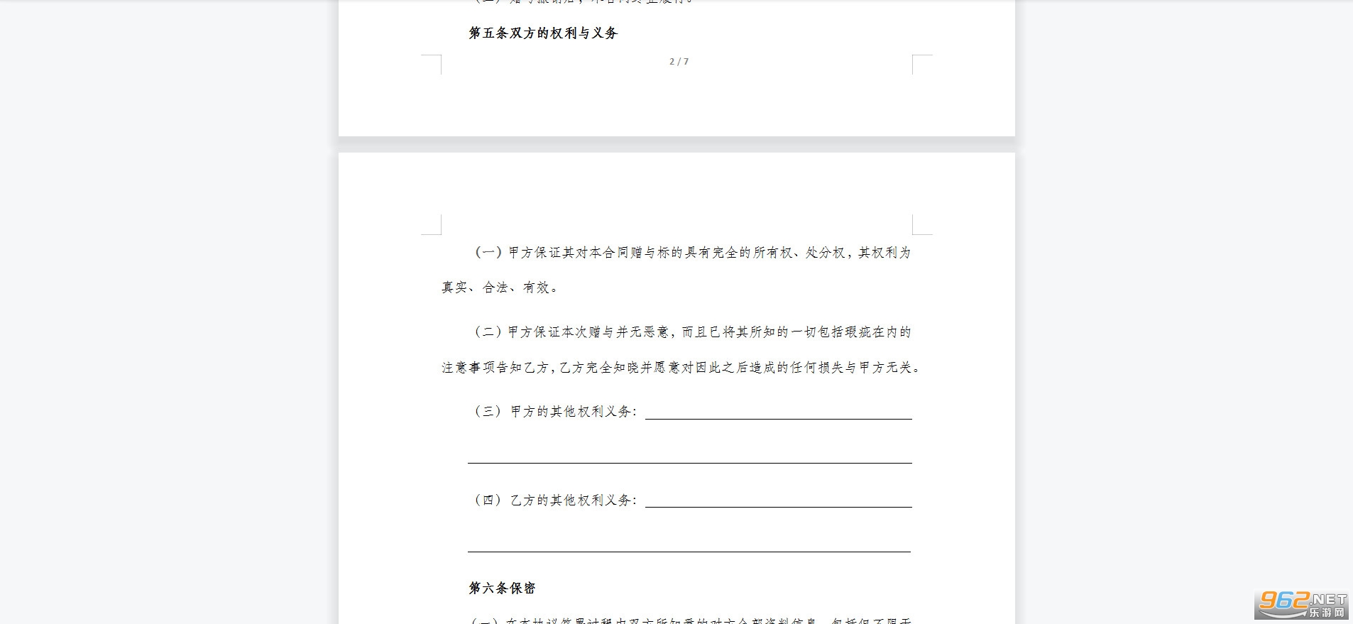 (一)甲方保证其对本合同赠与标的具有完全的所有权、处分权,其权利为真实、合法、有效。