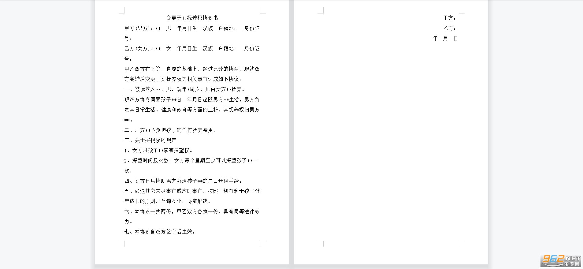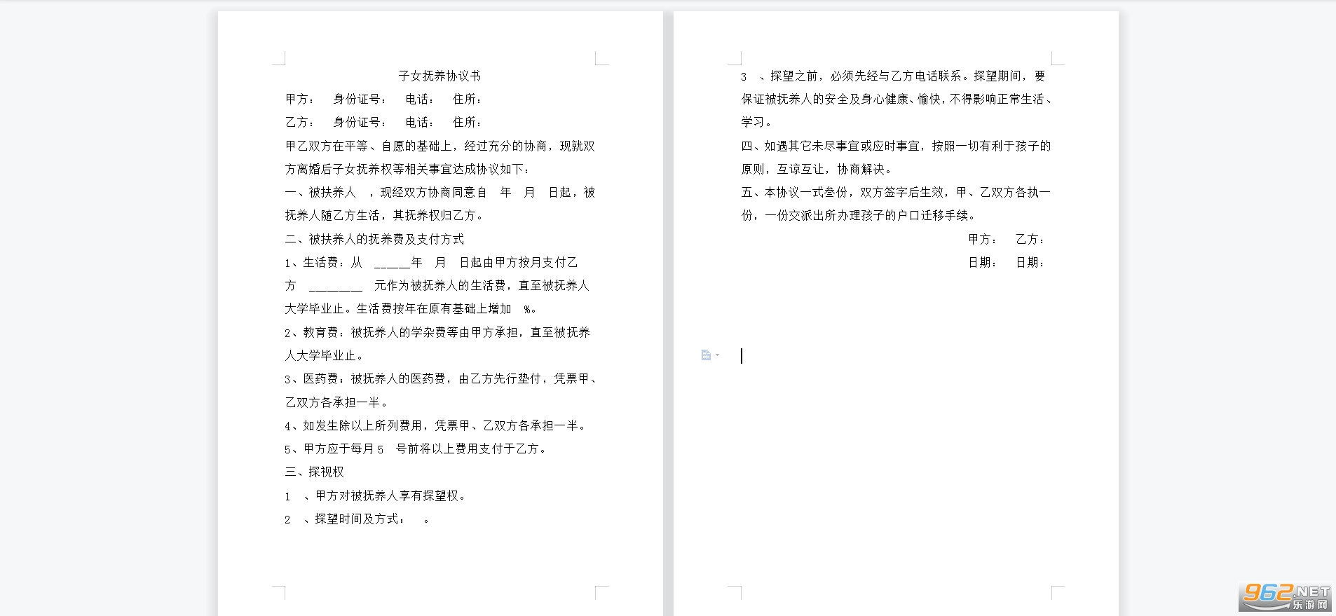 四、甲方对子女享有探望权,乙方无正当理由不可剥夺甲方对孩子的探望权,也不得剥夺孩子对甲方的探望权。