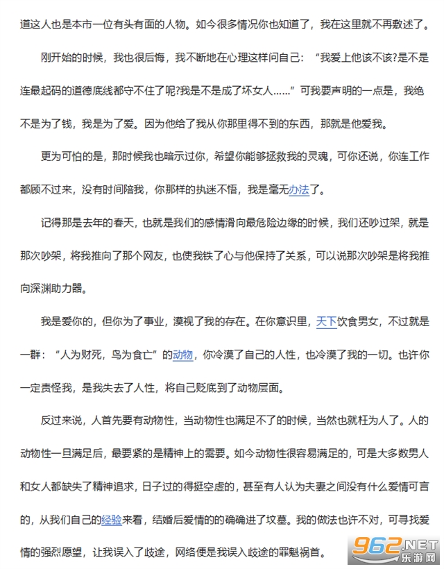 也许你急于知道的就是,我是怎么一步一步地滑向背叛你的深渊的。当一个人感觉非常无奈孤独的时候,就会想到倾诉,想得到心理寄托,正是这种心理寄托促使我迷上了网恋。我进了各种各样的BBS,刚开始的时候,也是拿不定主意,这里转一转,那里瞄一瞄。直到有一天,进了全国有名的QQ聊天室,跟一个叫“程积斯汗”的聊上后,我非常敬佩他的洞察力。甚至他还知道我是干什么的,这一来我们更走近了一步,后来互留了电话,才知道这人也是本市一位有头有面的人物。如今很多情况你也知道了,我在这里就不再敷述了。