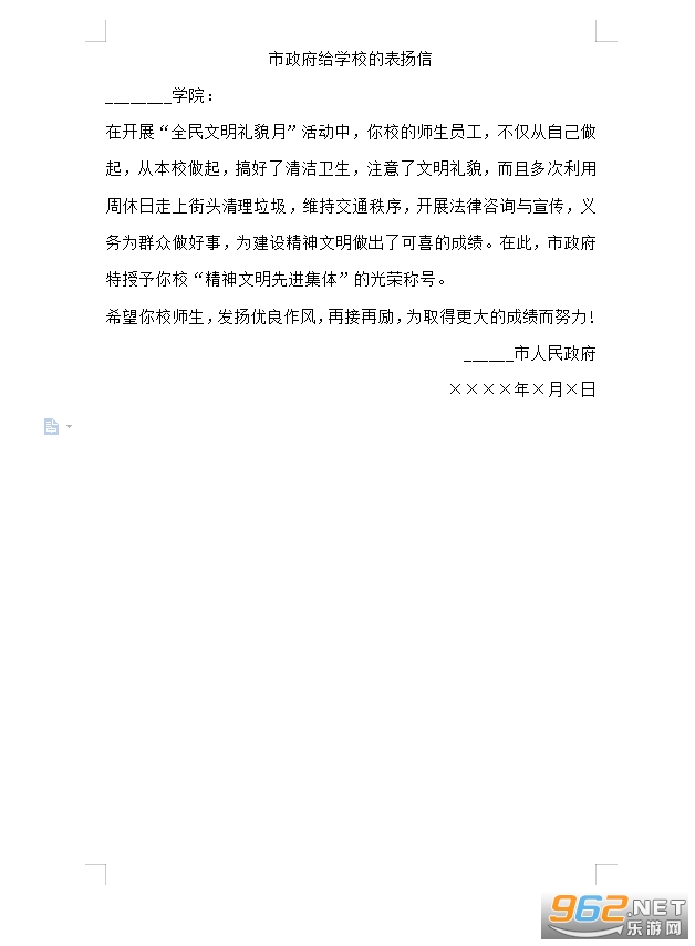 市政府给学校的表扬信