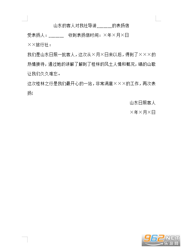 我们是山东日照一批客人,这次从×月×日来以后,得到了×××的热情接待,通过她的讲解了解到了桂林的风土人情和概况,唱的山歌让我们久久难忘。