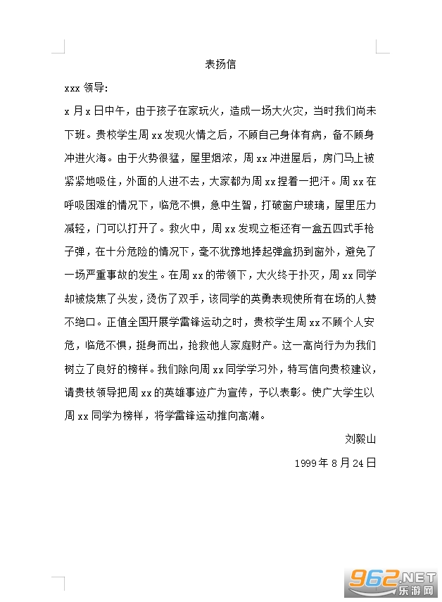 x月x日中午,由于孩子在家玩火,造成一场大火灾,当时我们尚未下班。贵校学生周xx发现火情之后,不顾自己身体有病,备不顾身冲进火海。由于火势很猛,屋里烟浓,周xx冲进屋后,房门马上被紧紧地吸住,外面的人进不去,大家都为周xx捏着一把汗。周xx在呼吸困难的情况下,临危不惧,急中生智,打破窗户玻璃,屋里压力减轻,门可以打开了。救火中,周xx发现立柜还有一盒五四式手枪子弹,在十分危险的情况下,毫不犹豫地捧起弹盒扔到窗外,避免了一场严重事故的发生。在周xx的带领下,大火终于扑灭,周xx同学却被烧焦了头发,烫伤了双手,该同学的英勇表现使所有在场的人赞不绝口。