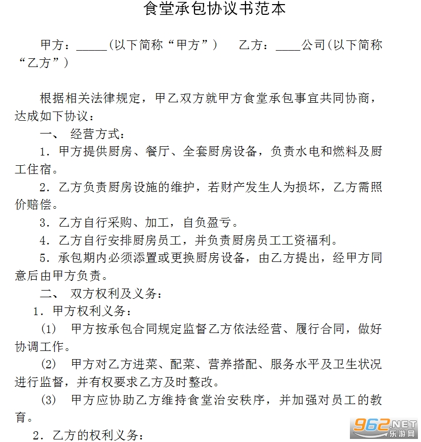 (1)乙方负责食堂的经营管理,具体包括食堂人事、菜肴的搭配与制作、就餐环境卫生、服务等。