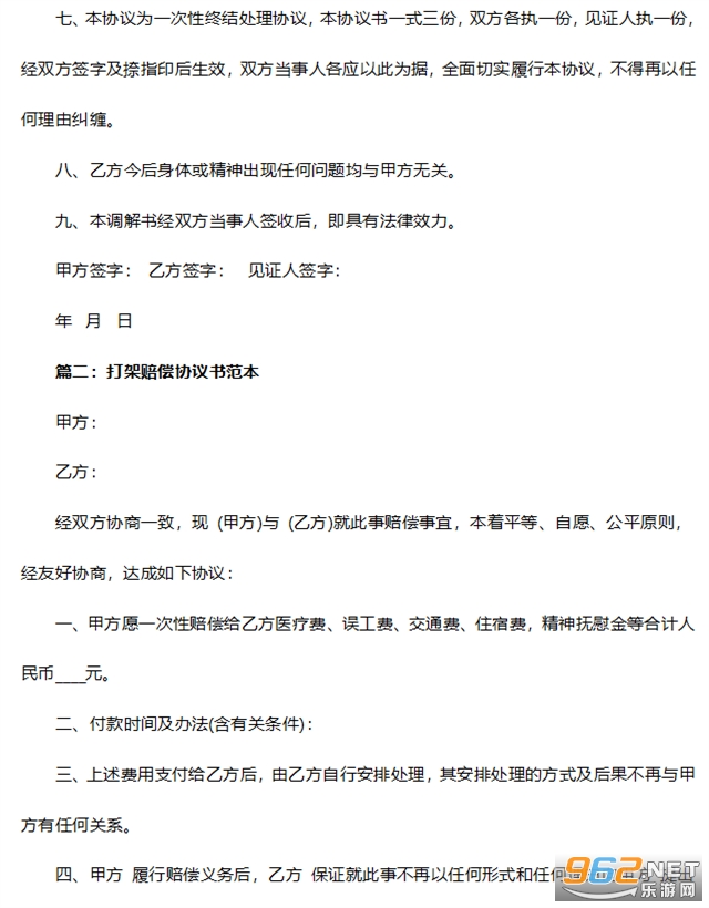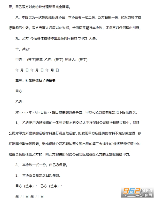 《打架赔偿协议书》为大家带来5份打架私了赔偿协议范文,经过打架双人协商取得统一意见并且在见证人的见证下签订,避免后续出现各种纠纷问题。直接下载压缩包进行解压就能够得到打架赔偿协议书文档了哦!