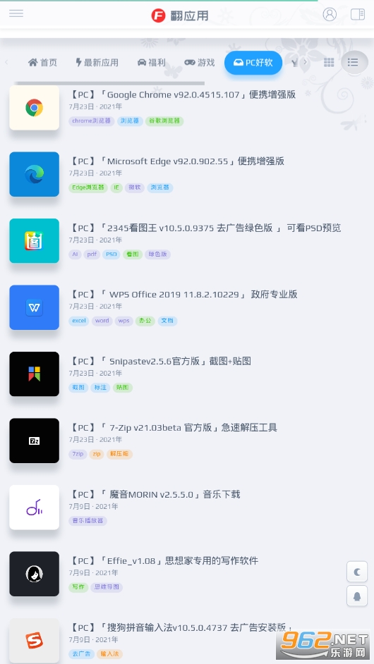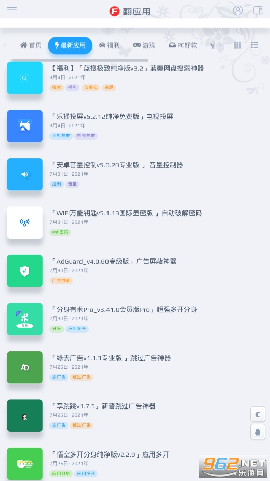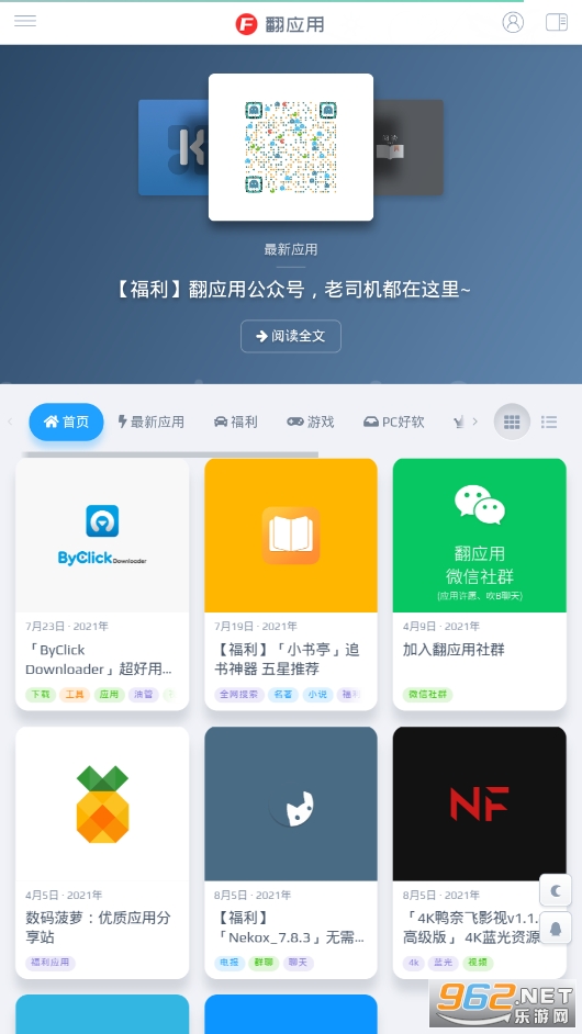 《翻应用app》是一款有着优质应用资源的平台,包括最新应用,福利,游戏,pc好软件,教程,应用集等等,每天都会为用户分享一些好用,好玩,有趣的游戏或者软件,让你可以轻松下载,快速找到日常生活中好用的东西,使用方便,有需要的话就来下载吧!