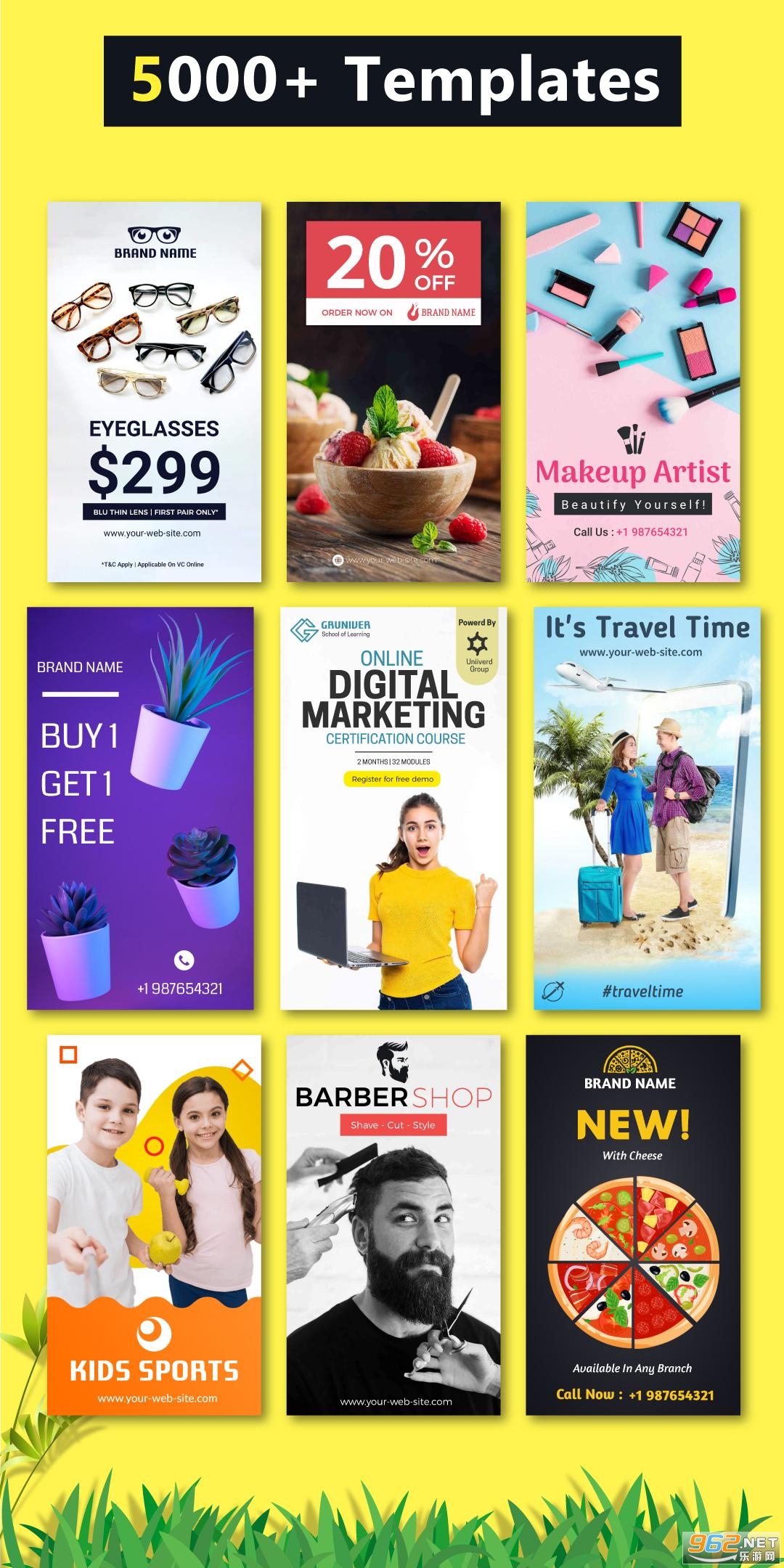 此徽标制作器和图形设计应用程序可用于社交媒体营销和创建徽标、传单、信息图表、小册子、名片、邀请函、封面、缩略图、海报、广告、Facebook 帖子、Instagram 帖子、Instagram 故事、博客横幅、品牌身份材料、卷起横幅、礼品卡、照片拼贴、餐厅菜单、演示文稿、信头设计等。
