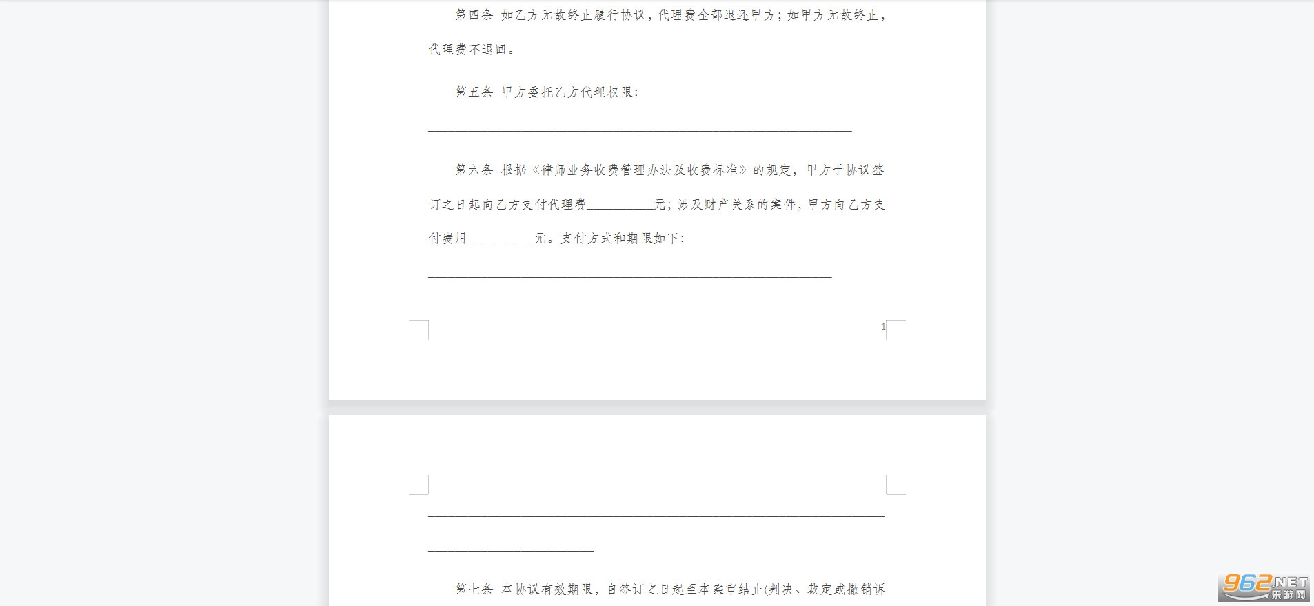 第六条 根据《律师业务收费管理办法及收费标准》的规定,甲方于协议签订之日起向乙方支付代理费__________元;涉及财产关系的案件,甲方向乙方支付费用__________元。支付方式和期限如下: