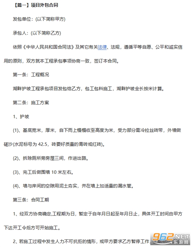 湖畔护坡工程承包项目发包给乙方,包工包料施工,湖畔护坡全长按米计算。