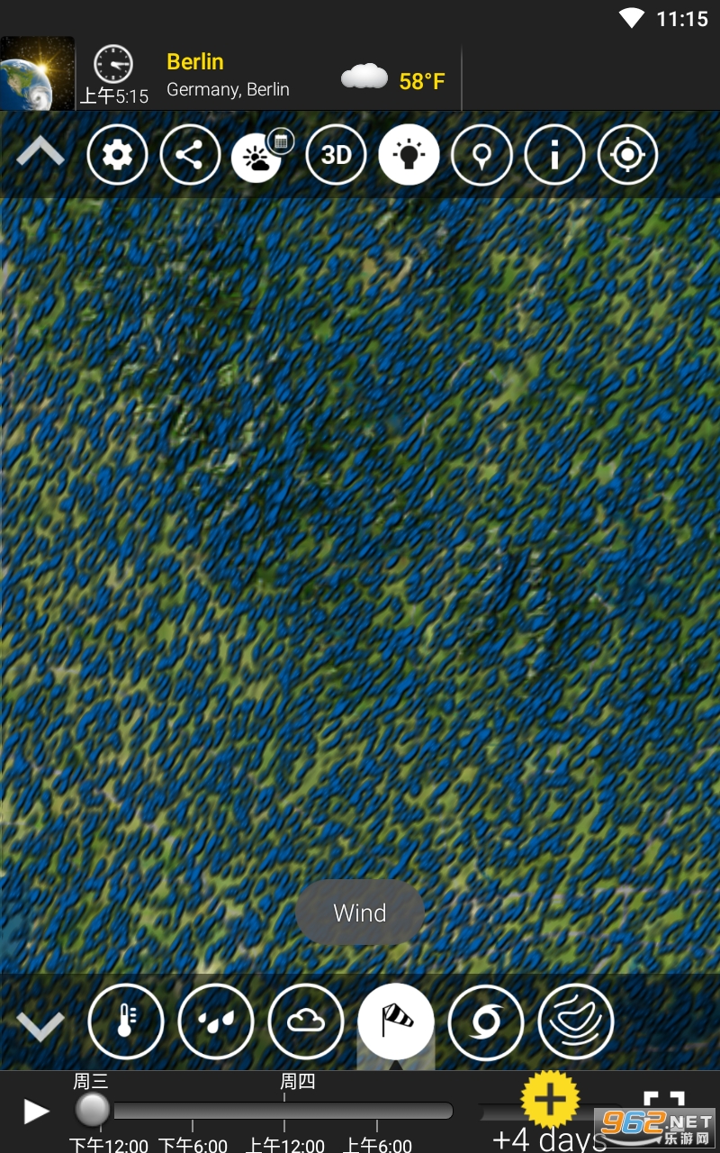 7.风动画:显示空气的运动(风速和方向),彩色区域显示温度。风动画在全球范围内可用。