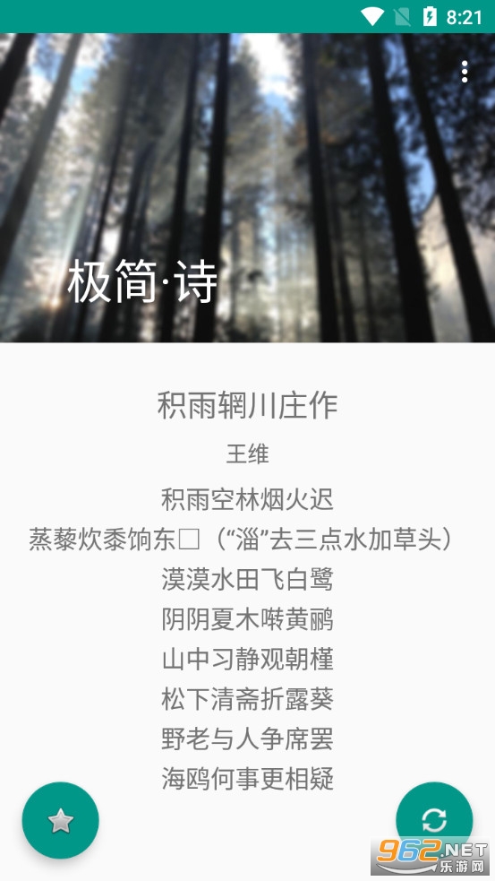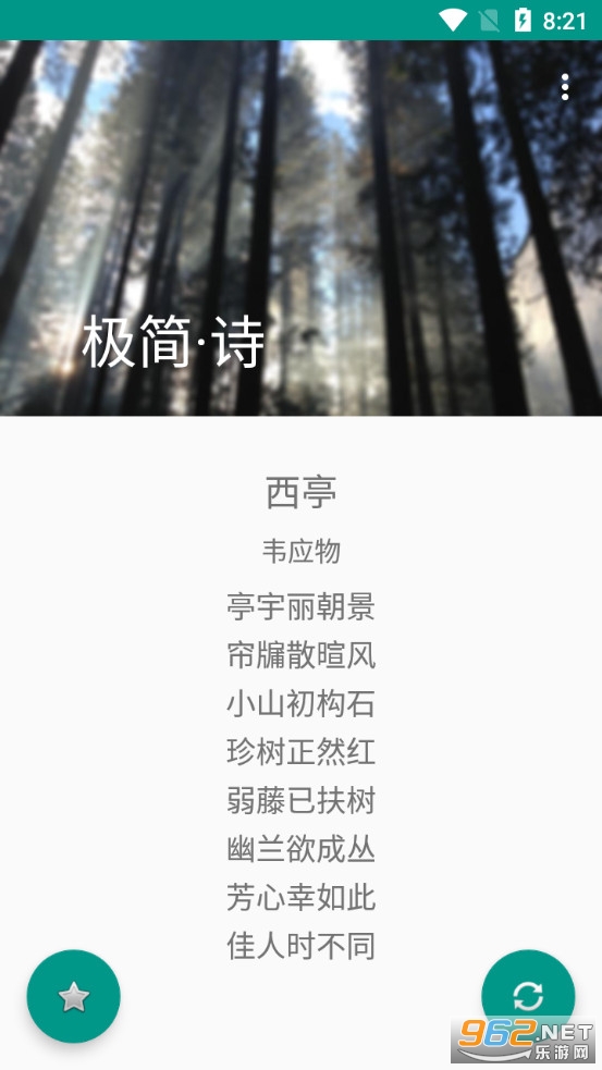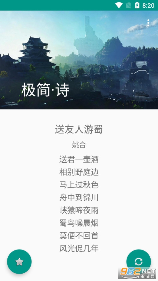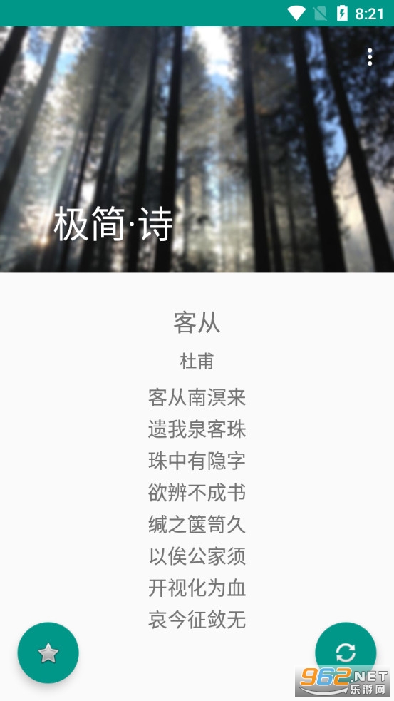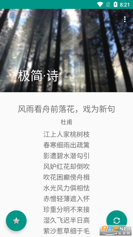 《极简诗app》是一款界面简约的学习古诗词的软件,极简诗app收录了众多的故事,朋友们可以在软件中进行阅读学习,不过本款软件不支持搜索功能,只能点击右下角的刷新按钮来随机显示古诗,可以点击左下角的收藏按钮收藏自己喜欢的古诗,方便下次直接进入收藏目录浏览。