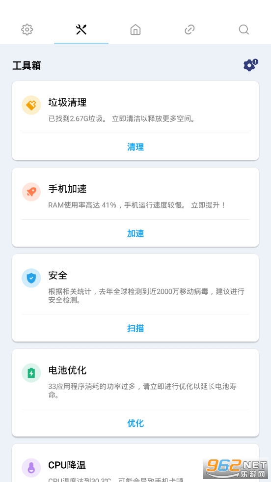 1.在软件的工具箱中,为用户提供了垃圾清理、手机加速、安全扫描、电池优化等等的功能,用户可以选择自己需要的内容进行在线的使用。
