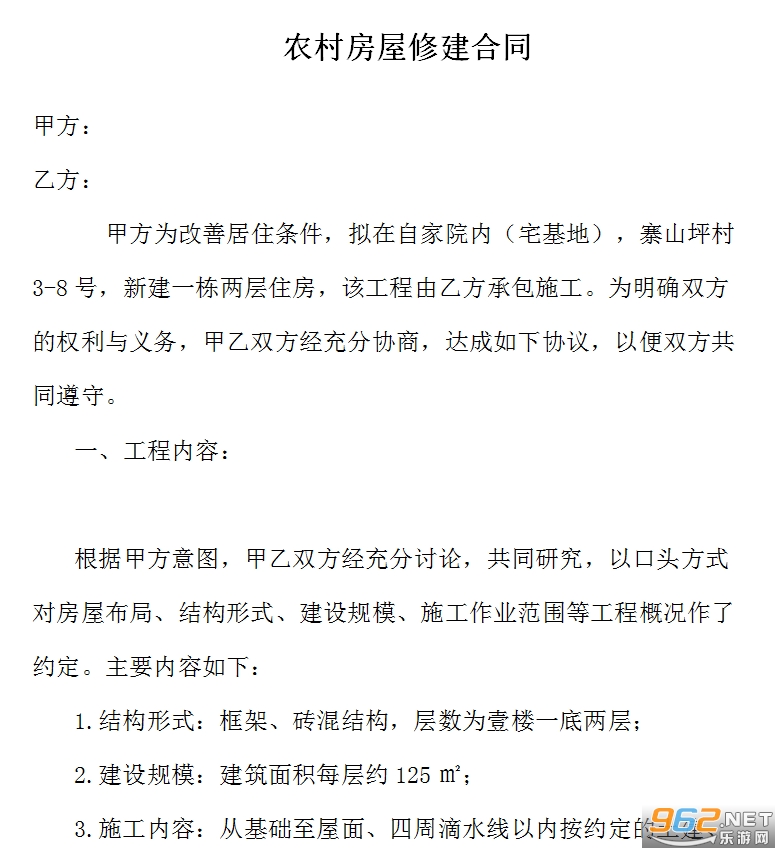 甲方为改善居住条件,拟在自家院内(宅基地),寨山坪村3-8号,新建一栋两层住房,该工程由乙方承包施工。为明确双方的权利与义务,甲乙双方经充分协商,达成如下协议,以便双方共同遵守。