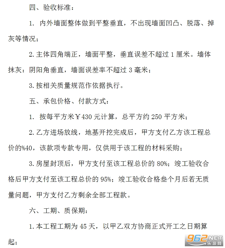 2.主体四角端正,墙面平整,垂直误差不超过1厘米。墙体抹灰:阴阳角垂直,墙面误差率不超过3毫米;