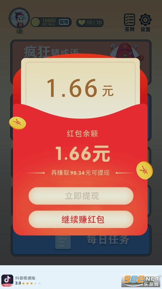 一款给力轻松的成语赚钱软件,简单的赚钱方式方法,只需要按照要求回答成语关卡的问题就可以,福利多多,红包多多,喜欢就来962体验一下吧!