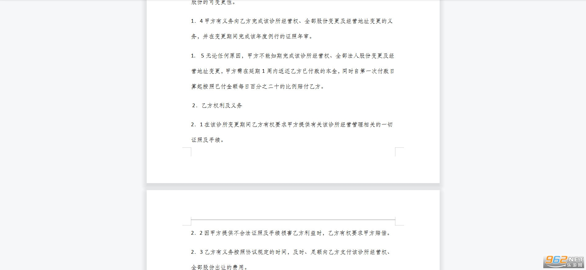 1.3甲方保证提供该诊所一切证照的准确性、合法性、时效性及经营权和全部股份的可变更性。