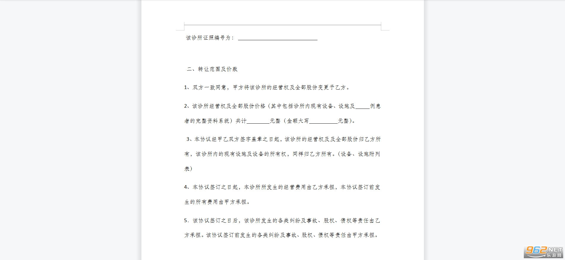 1、双方一致同意,甲方将该诊所的经营权及全部股份变更予乙方。