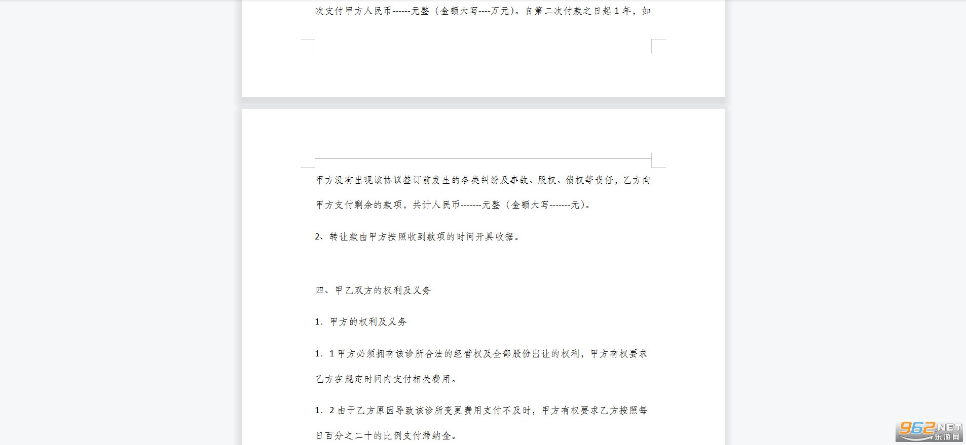1.1甲方必须拥有该诊所合法的经营权及全部股份出让的权利,甲方有权要求乙方在规定时间内支付相关费用。