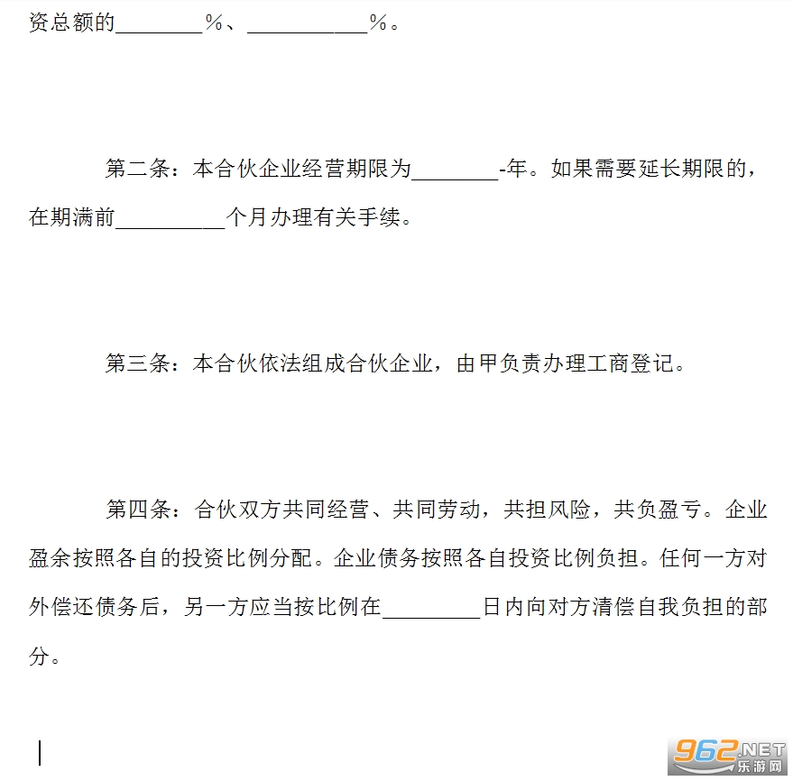 第四条:合伙双方共同经营、共同劳动,共担风险,共负盈亏。企业盈余按照各自的投资比例分配。企业债务按照各自投资比例负担。任何一方对外偿还债务后,另一方应当按比例在_________日内向对方清偿自我负担的部分。