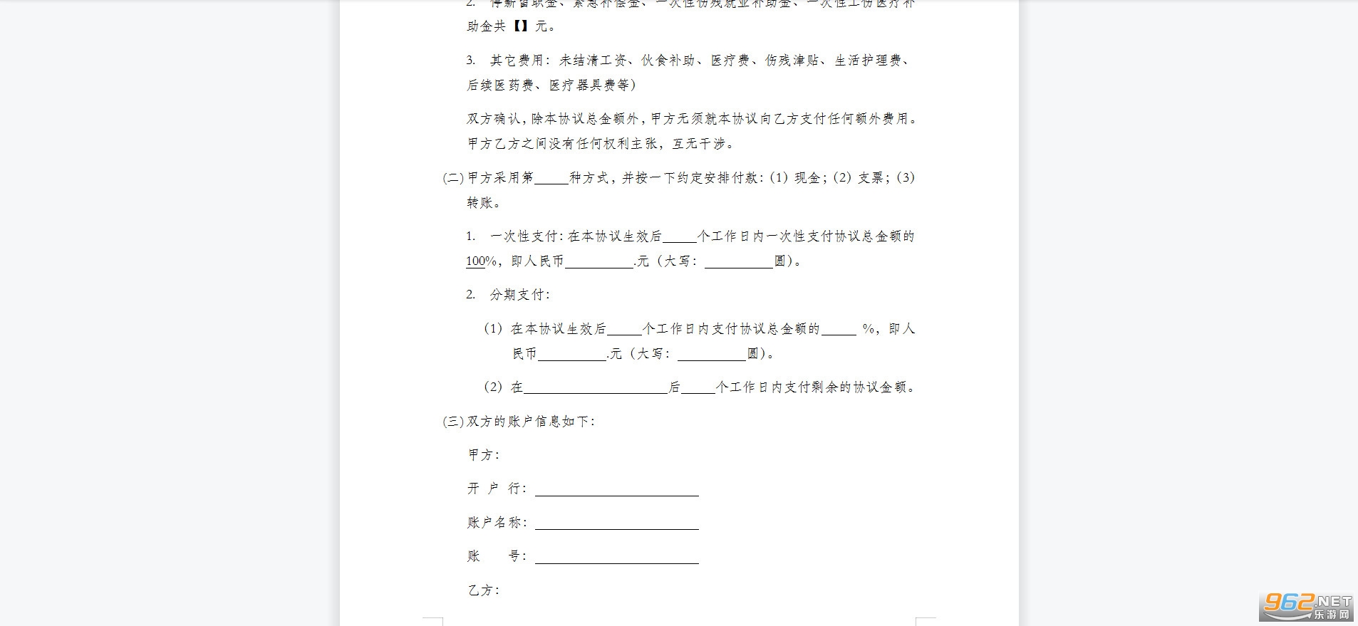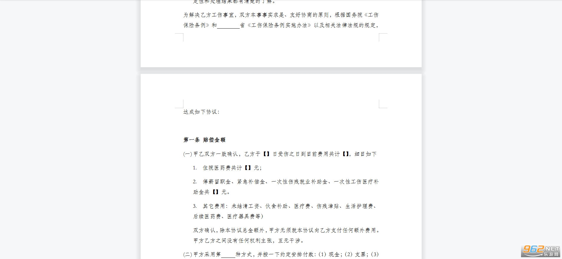 (一)甲乙双方一致确认,乙方于【】日受伤之日到目前费用共计【】,细目如下