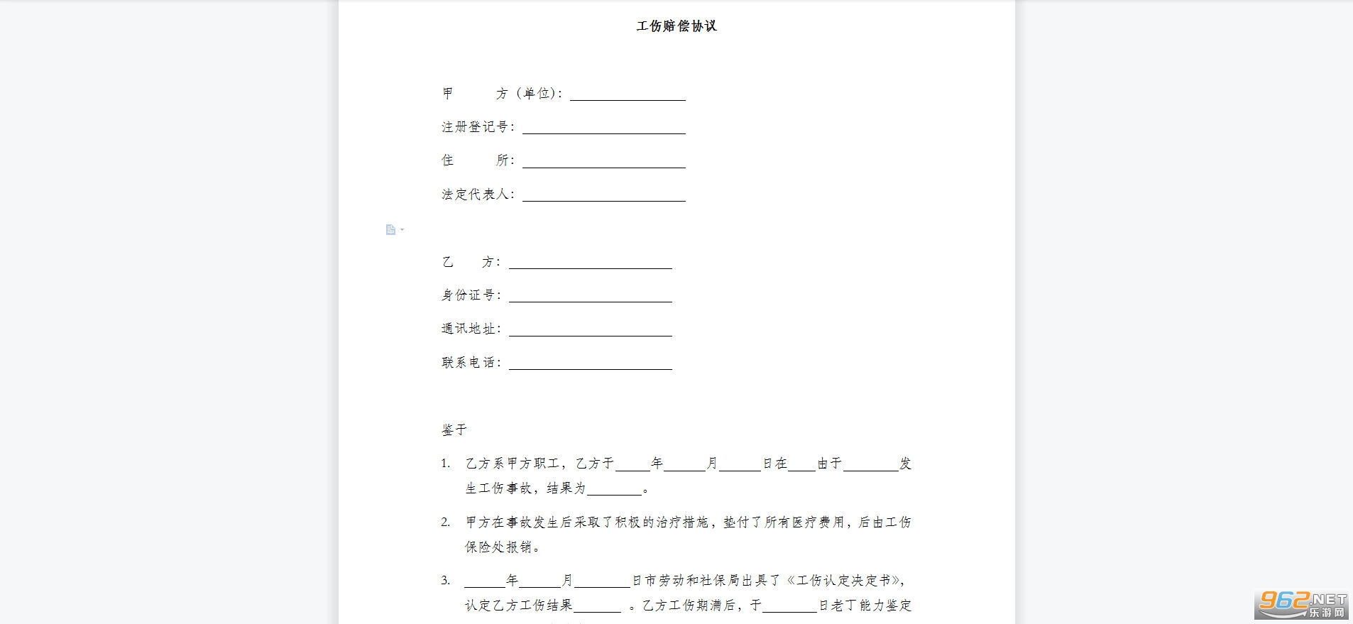 1.乙方系甲方职工,乙方于 年 月 日在 由于发生工伤事故,结果为。