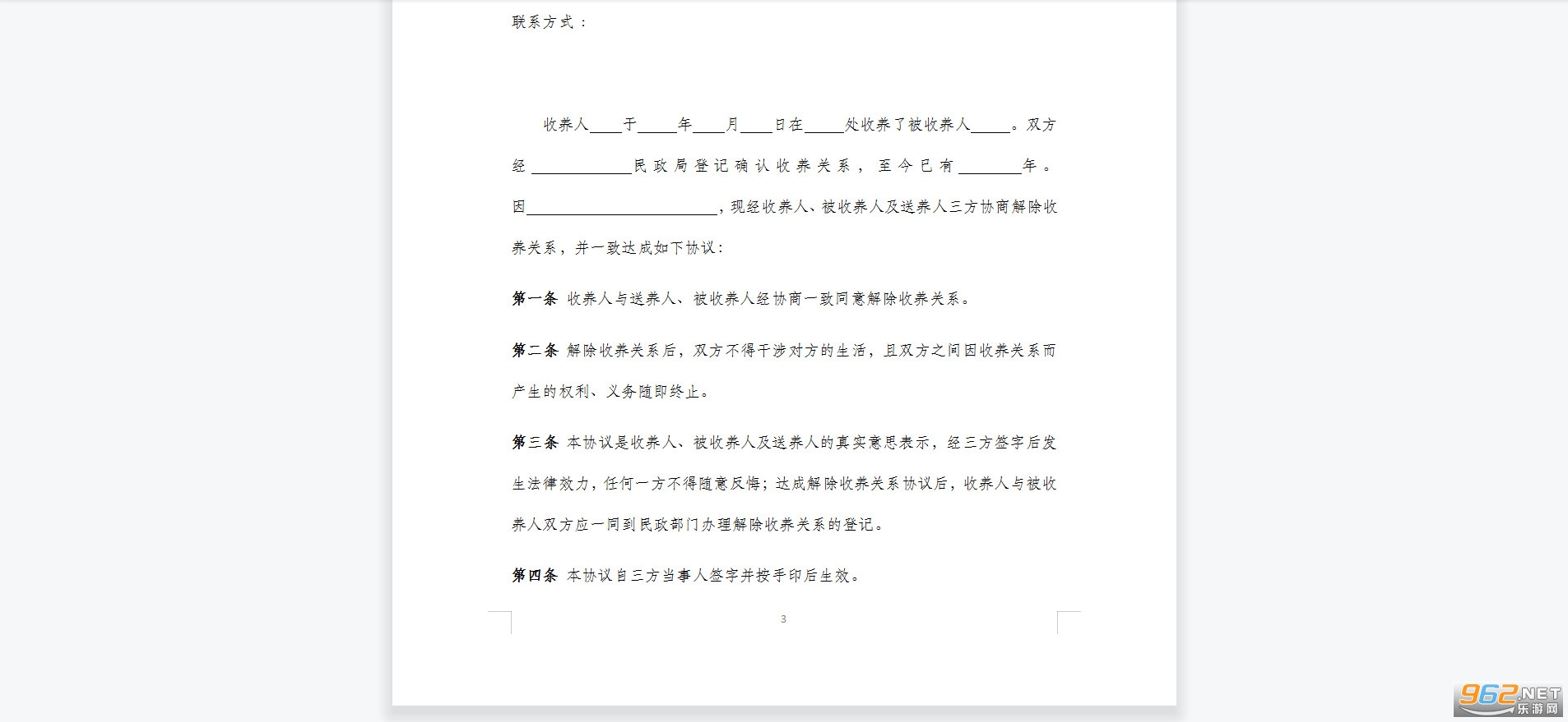 第一条 收养人与送养人、被收养人经协商一致同意解除收养关系。