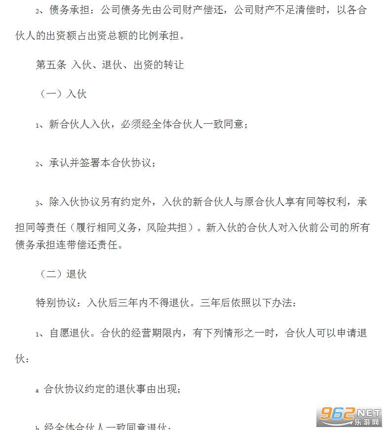 3、除入伙协议另有约定外,入伙的新合伙人与原合伙人享有同等权利,承担同等责任(履行相同义务,风险共担)。新入伙的合伙人对入伙前公司的所有债务承担连带偿还责任。