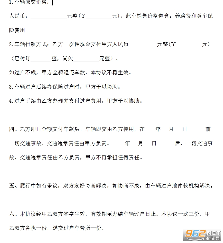 2.车辆付款方式:乙方一次性现金支付甲方人民币___________元整(¥__________元)(已付订________整,尚欠__________元整)。
