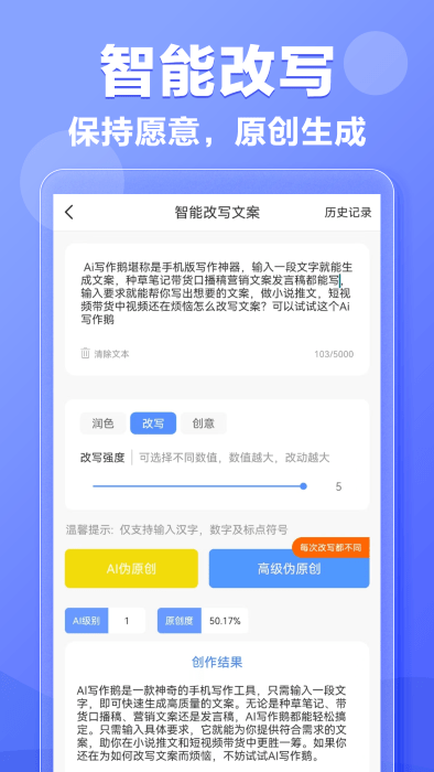 al写作鹅是一个专属于文章编写方面软件,支持文案提取和文案改写功能,智能文章和ai绘画自动生成器,输入需关键词,一键生成高质量原创文案,适用范围广,支持教案设计,高效智能。提取文案后一键改写,高效便捷,原创度高,工作总结,广泛用于教育,电商产品描述等功能,工作,电商等领域。