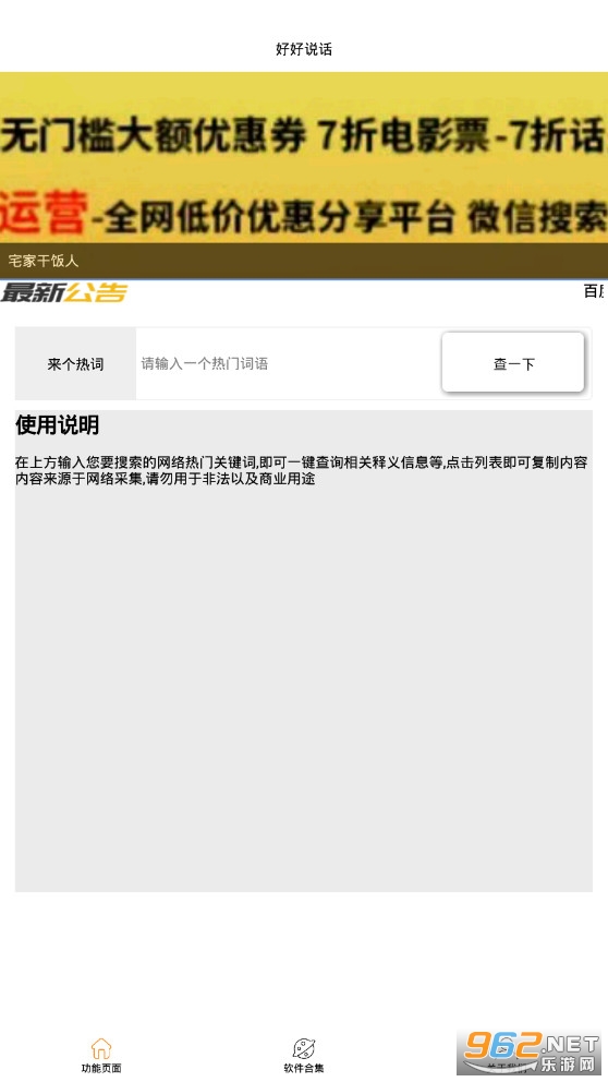 《好好说话apk》是一款当下最为流行语句的翻译软件,收录了非常多网络上广泛流传的网络热剧以及精辟的句子,其中有非常多有意思的精简的语句热词你都可以在其中找到,只需要你将所需要表达的基本内容信息,精炼成为几段话,然后输入到指定的搜索区域,它就能够为你迅速匹配到相应的词语!