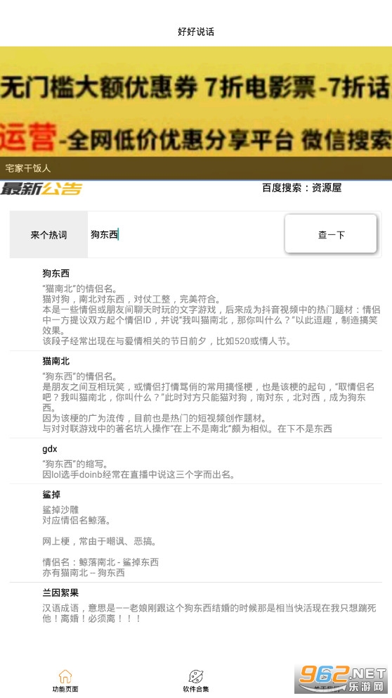 好好说话是一款非常实用的网络用语词汇的翻译app,词汇丰富,你可以直接在线查看缩略词的的详细解释,适用于各行各业的缩略词,并告诉你如何实用,虽然体积小,但是功能强大,查询的速度很快,告别卡段,让你随时跟上潮流,熟练运用缩略词,再也不用对 一堆火星语迷茫了,紧跟年轻人的步伐,是一款非常实用的时尚交流的平台。