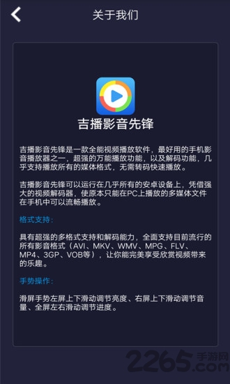 具有超强的多格式支持和解码能力,全面支持目前流行的所有影音格式(MKV、WMV、MPG、FLV、MP4、3GP、VOB等),让2265用户能完美享受欣赏视频带来的乐趣。