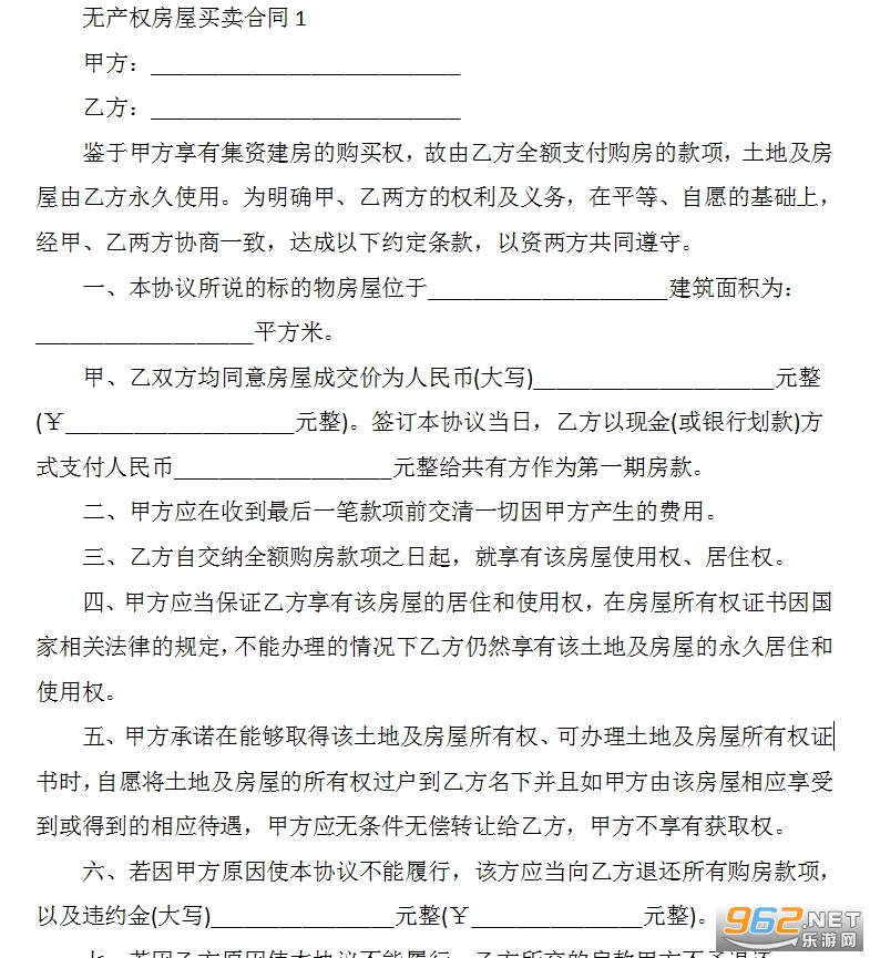 鉴于甲方享有集资建房的购买权,故由乙方全额支付购房的款项,土地及房屋由乙方永久使用。为明确甲、乙两方的权利及义务,在平等、自愿的基础上,经甲、乙两方协商一致,达成以下约定条款,以资两方共同遵守。
