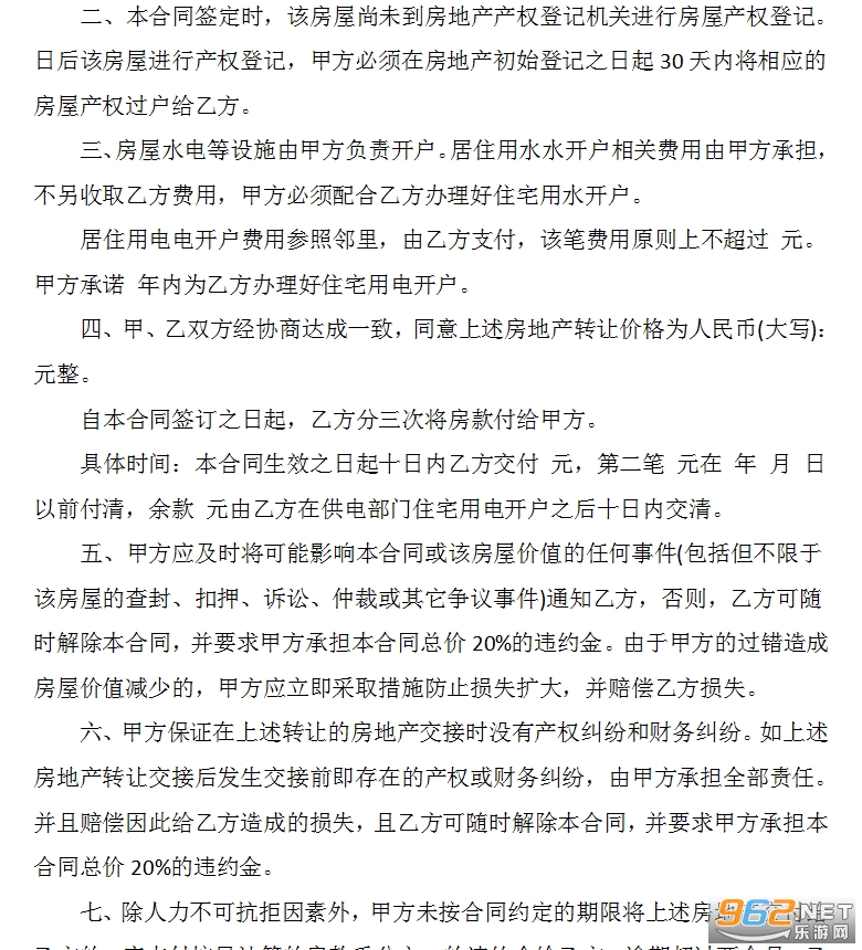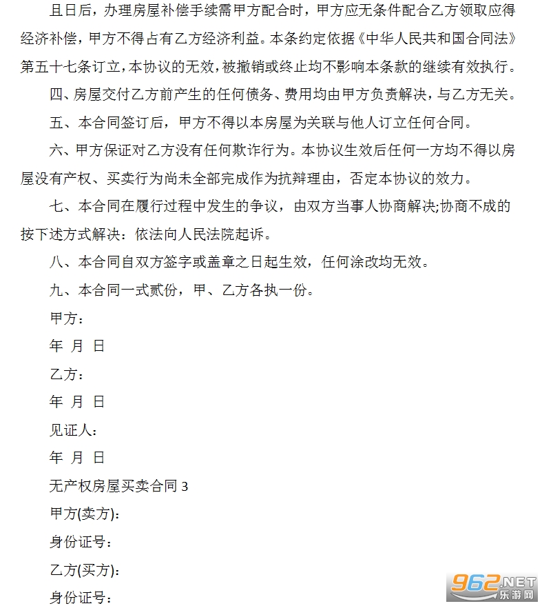 九、在乙方购房成交之后甲方不得有将该房屋用于抵押、转让及其他损害乙方权利的行为。