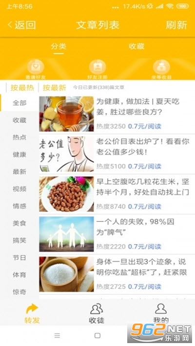 2、登录成功后,点击“视频”或者“文章”频道转发任意文章或者视频到,被阅读后就有现金奖励。