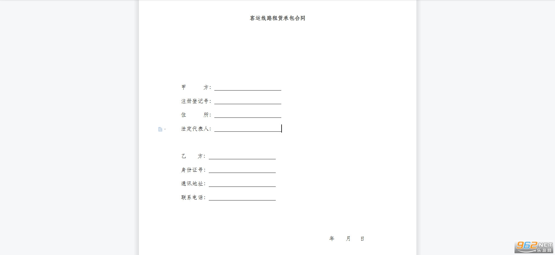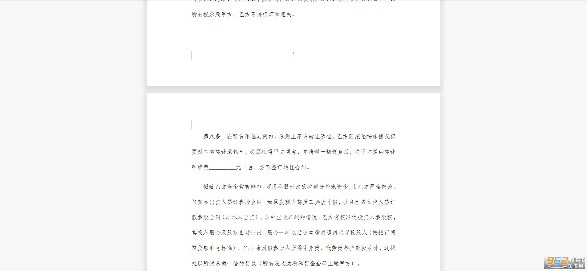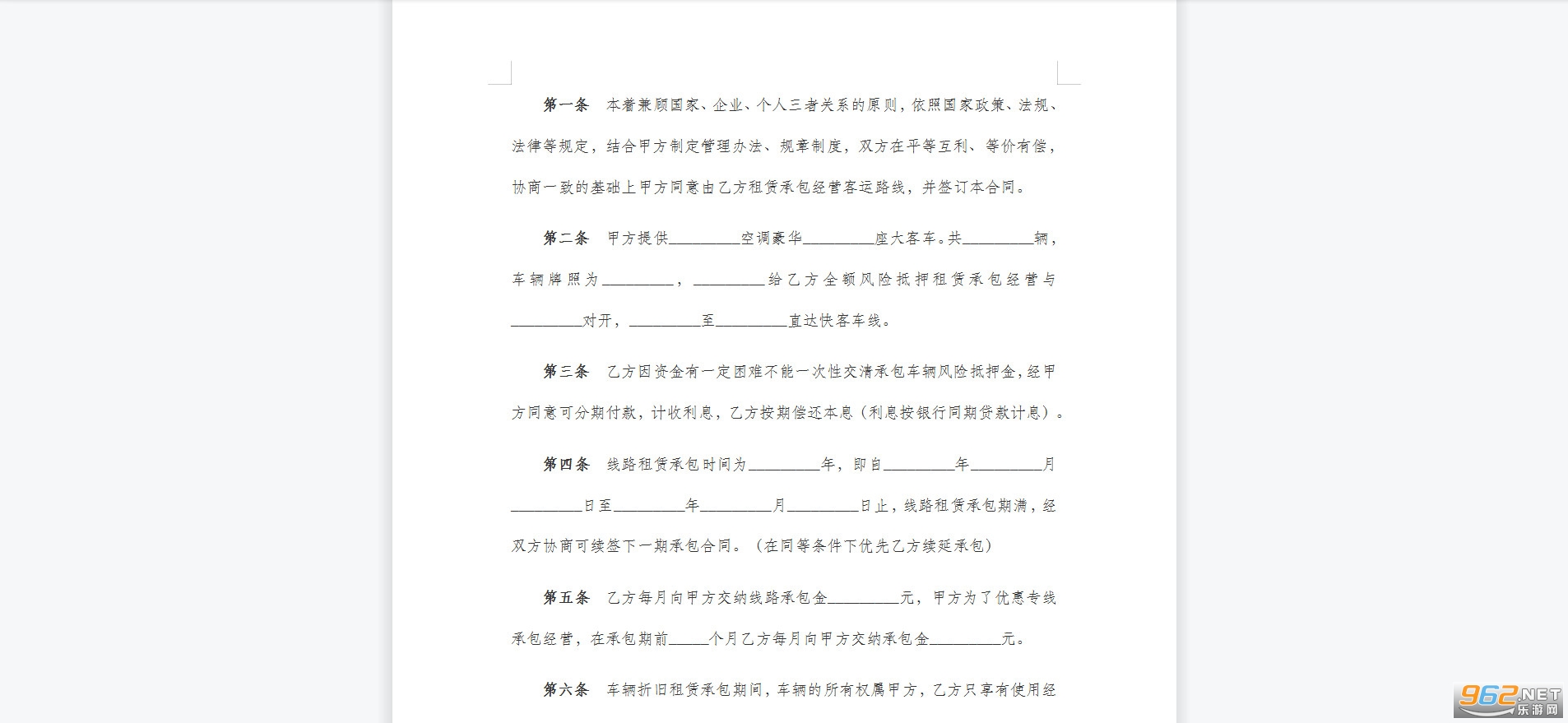 第二条 甲方提供_________空调豪华_________座大客车。共_________辆,车辆牌照为_________,_________给乙方全额风险抵押租赁承包经营与_________对开,_________至_________直达快客车线。