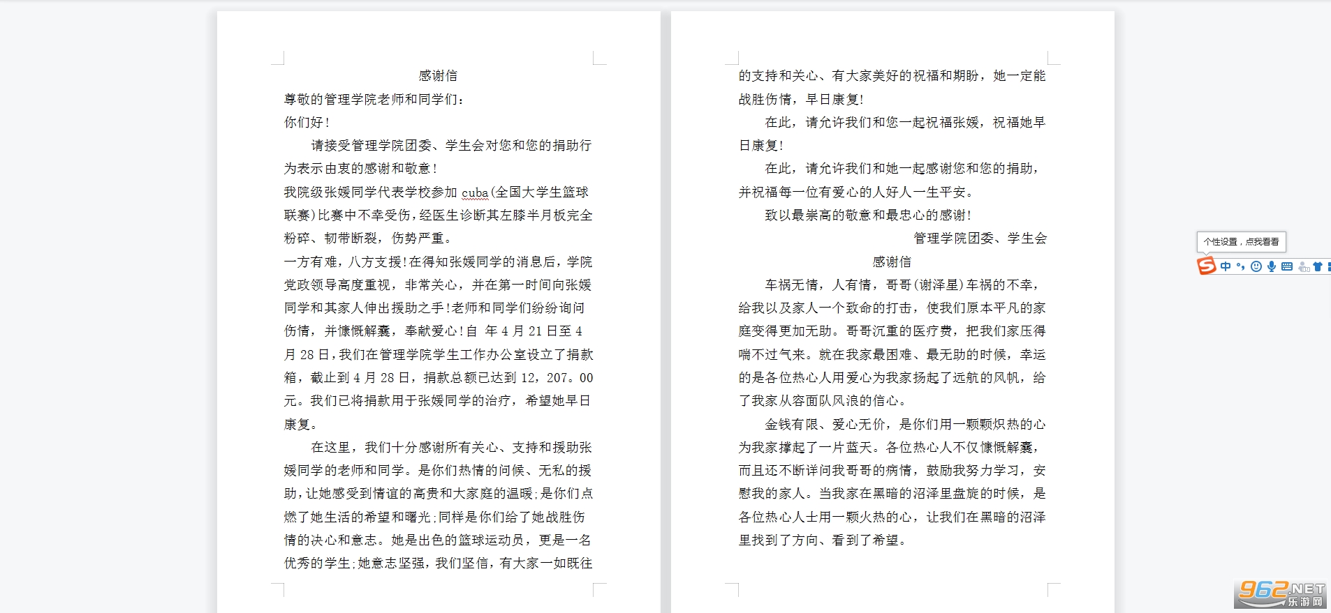 在这里,我们十分感谢所有关心、支持和援助张媛同学的老师和同学。是你们热情的问候、无私的援助,让她感受到情谊的高贵和大家庭的温暖;是你们点燃了她生活的希望和曙光;同样是你们给了她战胜伤情的决心和意志。她是出色的篮球运动员,更是一名优秀的学生;她意志坚强,我们坚信,有大家一如既往的支持和关心、有大家美好的祝福和期盼,她一定能战胜伤情,早日康复!