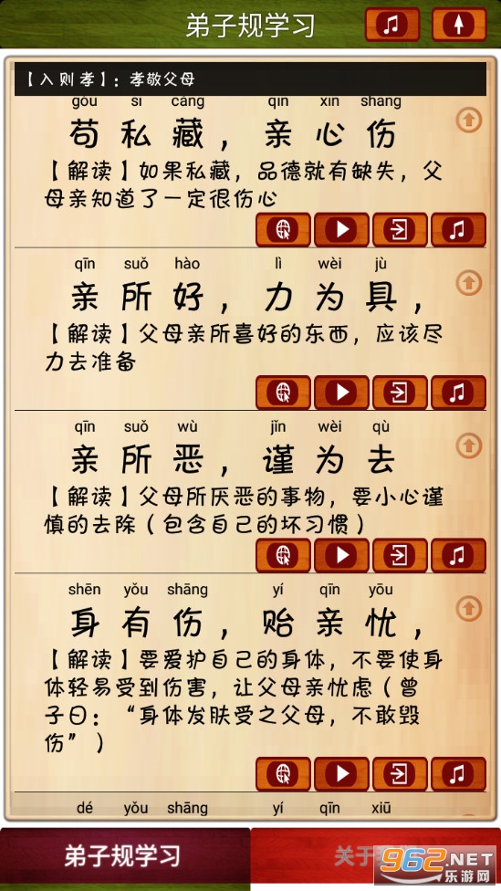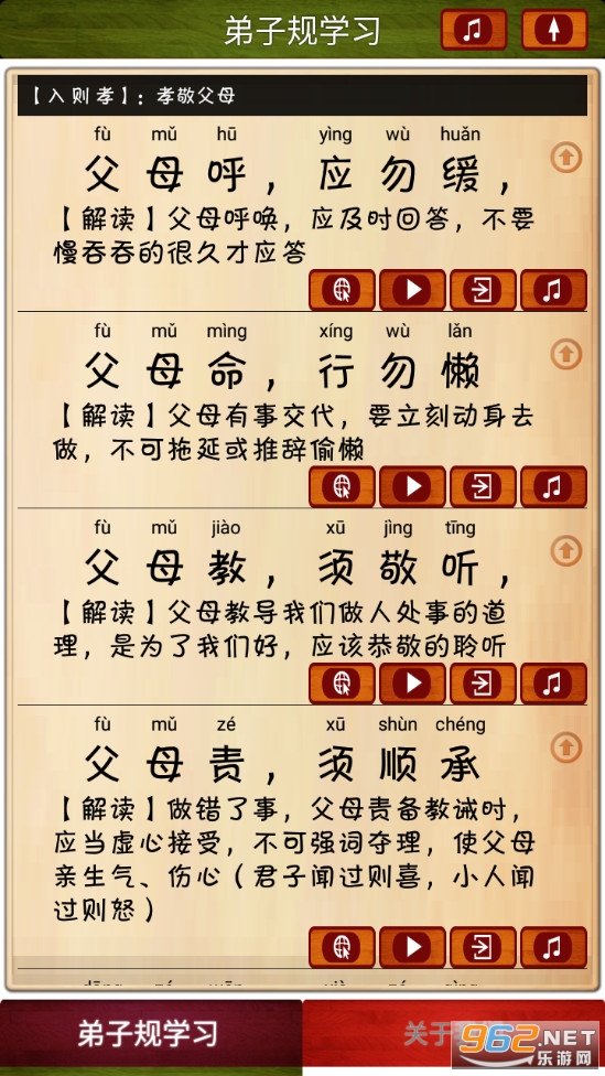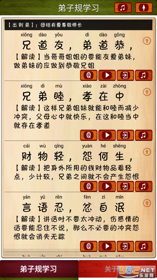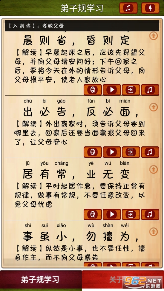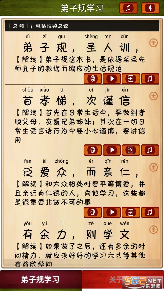 2.两种学习模式:一种分段朗读解释便于孩子家长共同理解学习弟子规;一种全文顺序循环朗读,逐行跟踪滚动显示当前朗读内容,便于孩子跟随一起咏读学习。