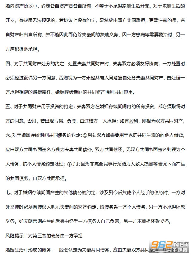 四、对于共同财产处分的约定:处置夫妻共同财产时,夫妻双方必须友好协商,一方处置时必须经过配偶另一方同意,否则视为一方未经共有人同意擅自处分夫妻共同财产,由处理一方承担相应的赔偿责任。婚姻存续期间的共同财产原则共同使用。