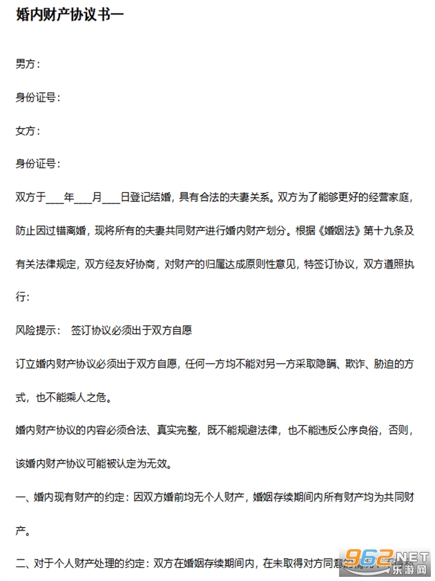 甲方:乙方:为划分甲乙双方在婚姻存续期间婚内财产的所占比例、收益、责任、处分等权利和义务,经双方平等协商达成一致意见,现签署协议如下:风险提示: 签订协议必须出于双方自愿