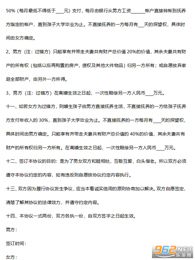 十一、如若女方为过错方,则婚生孩子由男方直接抚养生活,不直接抚养的一方给孩子抚养方支付年收入的30%,直到孩子大学毕业为止。不直接抚养的一方每月有____天的探望权,具体时间由男方确定。只能享有并带走夫妻共有财产总价值的40%的价值,其余夫妻共有财产的所有权归另一方所有。在离婚生效之日起,一次性赔偿另一方人民币____万元。