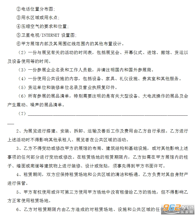 2、乙方每日使用租赁场地的时间为上午_________至下午_________。乙方和参展商可以在前述时间之前_________小时内进入展馆,在前述时间之后_________小时内撤离展馆。