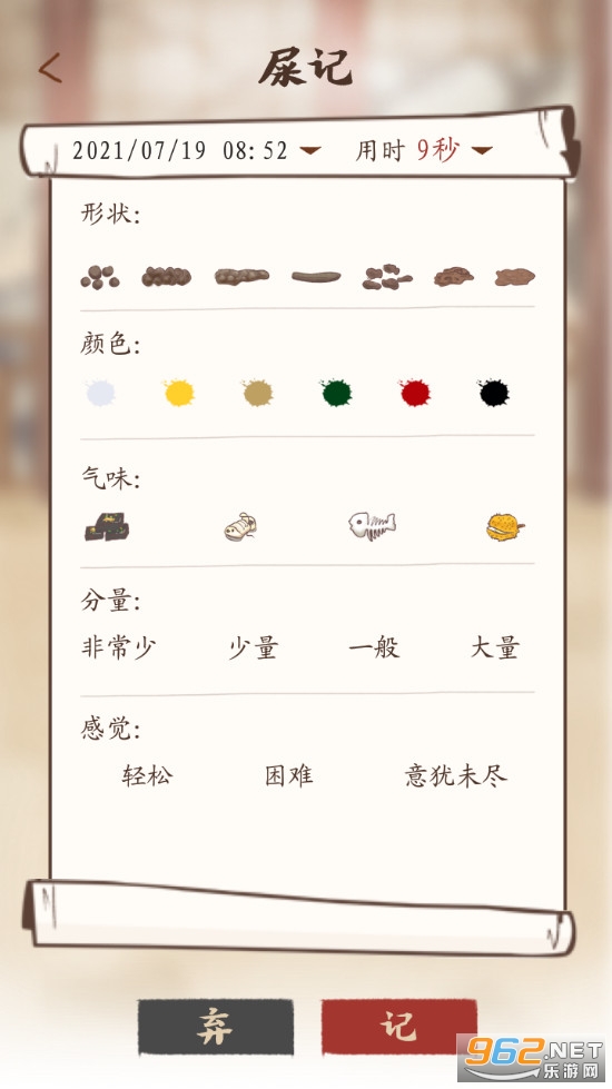 《屎记app》是上海旻匠网络科技有限公司推出的一款用来记录拉屎的软件,每当你蹲厕所的时候可以打开软件来记录一次,在结束的时候可以选择拉完了或者没拉出来,可以记录拉屎的形状、颜色、多少等,根据你的选择会给出一些健康说明,可以在便便日记查看全部的拉屎情况。