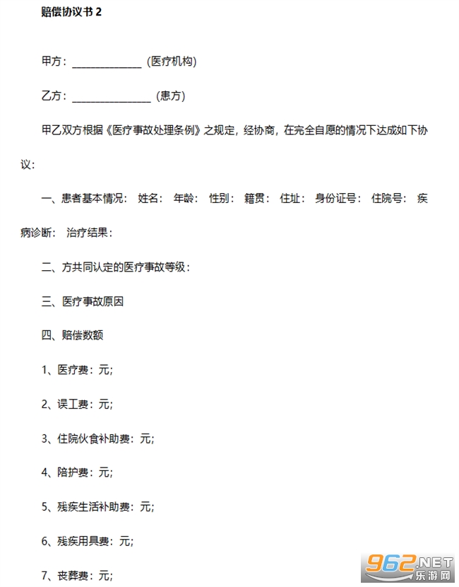 甲乙双方根据《医疗事故处理条例》之规定,经协商,在完全自愿的情况下达成如下协议:
