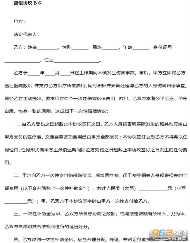 3、经甲乙双方协商同意,甲方再向乙方一次性办结和赔偿伤残待遇、一次性医疗补助金、误工费用等依法应由甲方给予的全部费用(以下合并简称“一次性补助金”),合计人民币 元(大写: ),由甲方在协议双方签字时一次性付完。