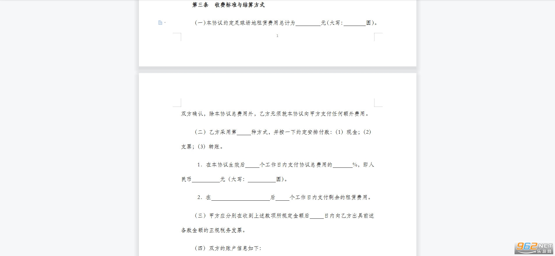 (一)本协议约定足球场地租赁费用总计为元(大写:圆)。双方确认,除本协议总费用外,乙方无须就本协议向甲方支付任何额外费用。