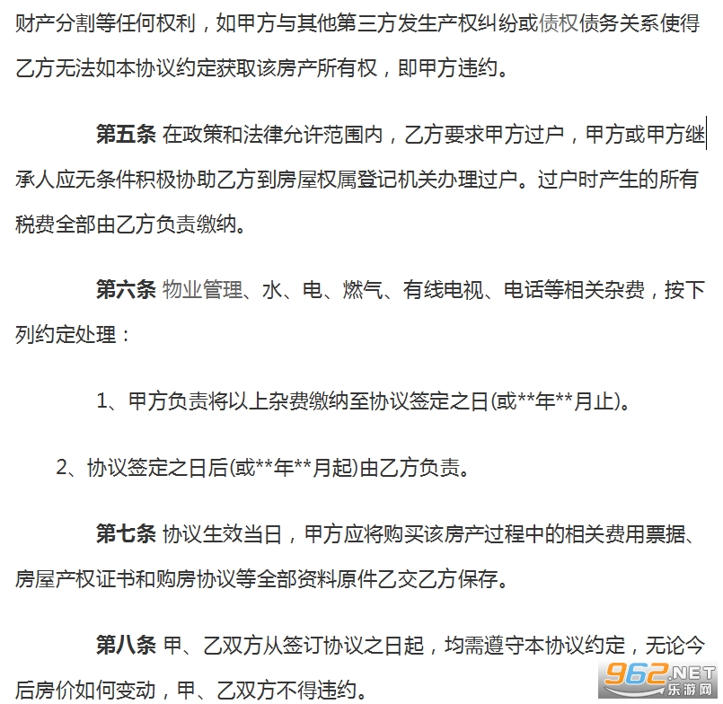 第五条 在政策和法律允许范围内,乙方要求甲方过户,甲方或甲方继承人应无条件积极协助乙方到房屋权属登记机关办理过户。过户时产生的所有税费全部由乙方负责缴纳。