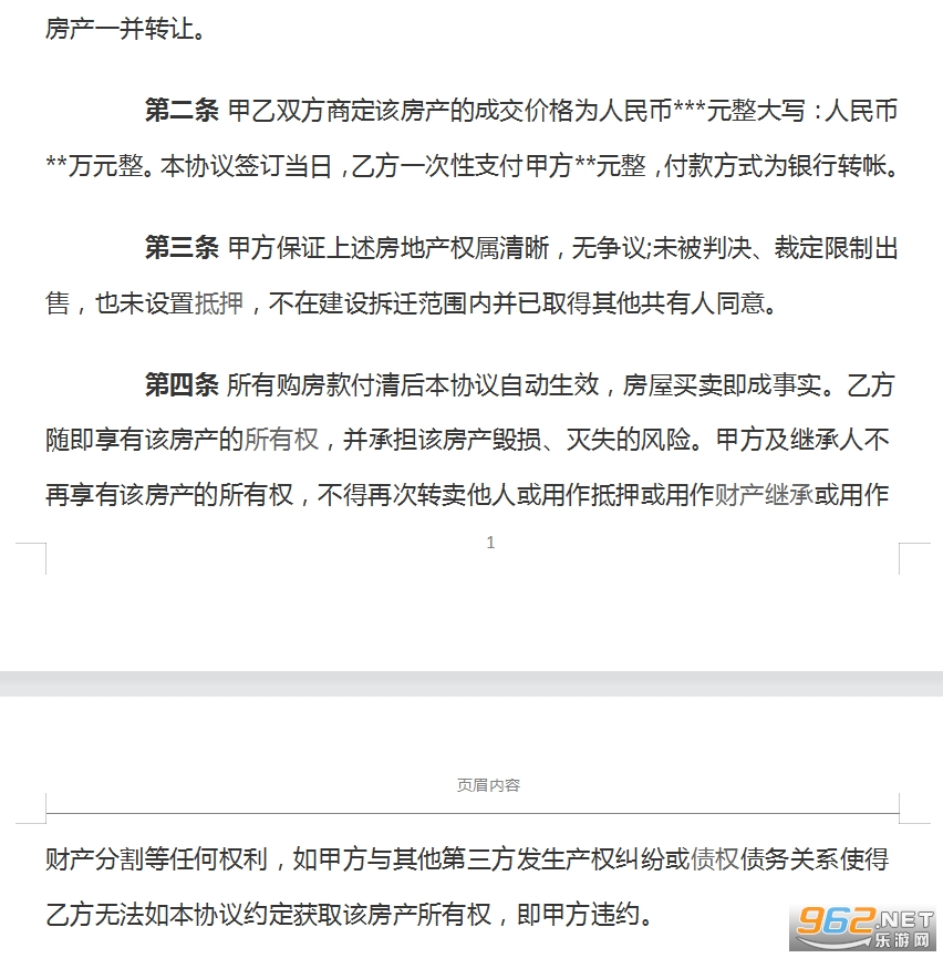 第二条 甲乙双方商定该房产的成交价格为人民币*元整大写:人民币万元整。本协议签订当日,乙方一次性支付甲方元整,付款方式为银行转帐。