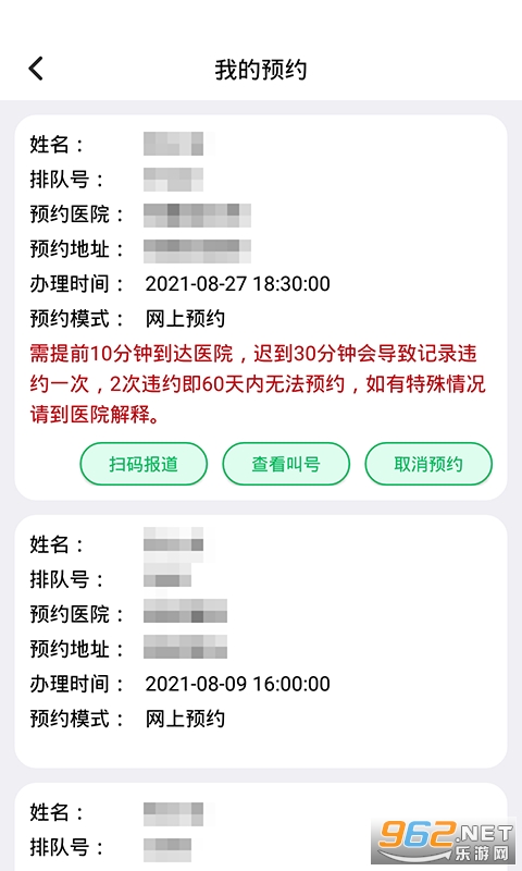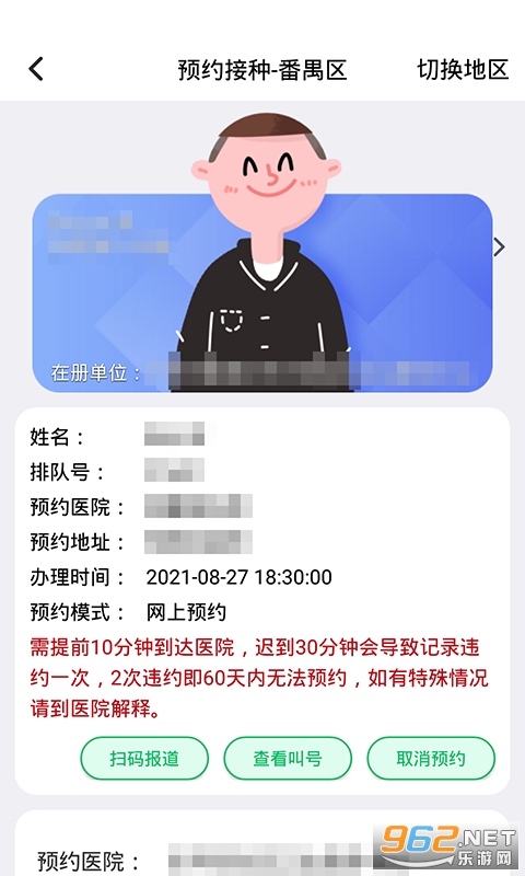 9、预约成功后会显示预约详情界面。接种当天可在APP首页点击右下角“我的”进入个人中心,点击“我的预约订单”查看预约详情或使用二维码取号接种。